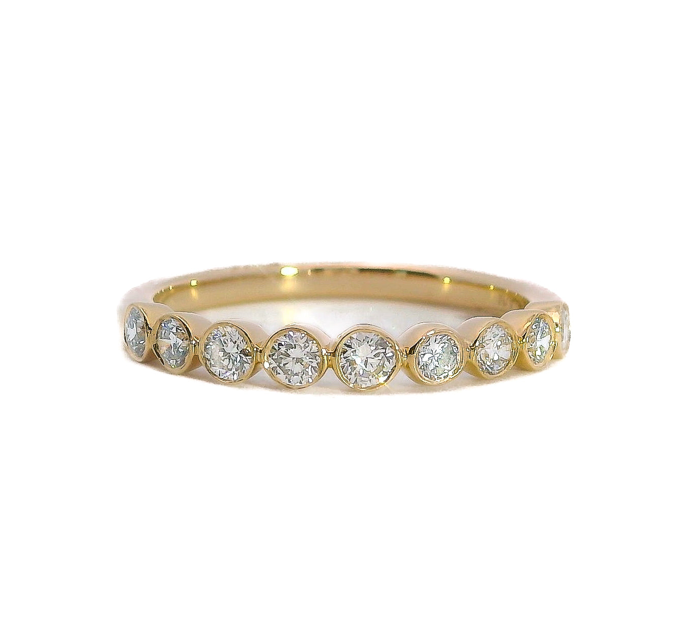 This elegant wedding band is crafted in 14 karat yellow gold and set with natural round diamonds in sleek bezel settings, totaling 0.50 carats. The clean design offers a timeless yet modern appeal, making it perfect for stacking or wearing as a standalone statement. A versatile piece, it’s ideal for everyday elegance or gifting on life’s most meaningful occasions.