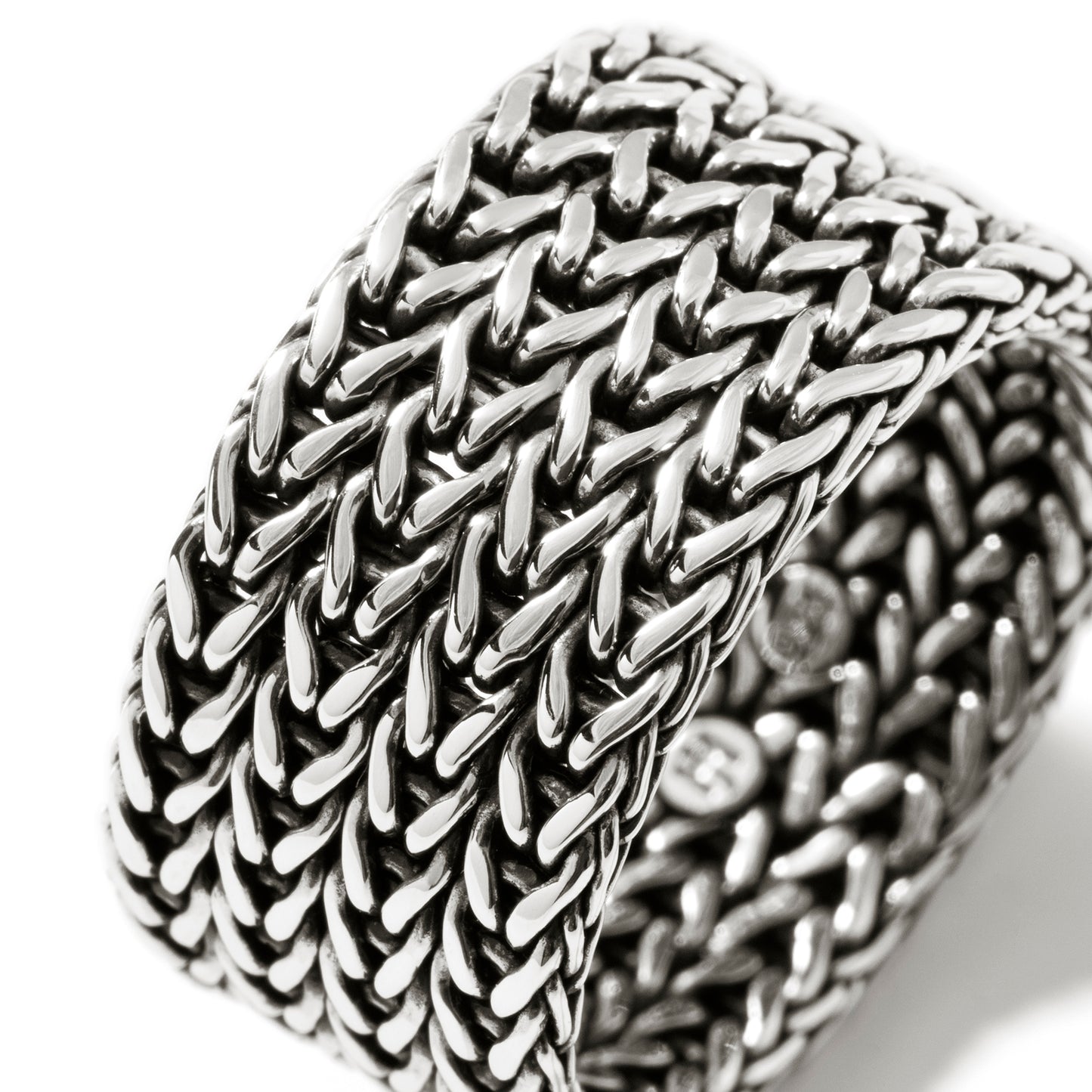 A seamless flat-weave ring with a low profile. Artisan handcrafted in reclaimed sterling silver.