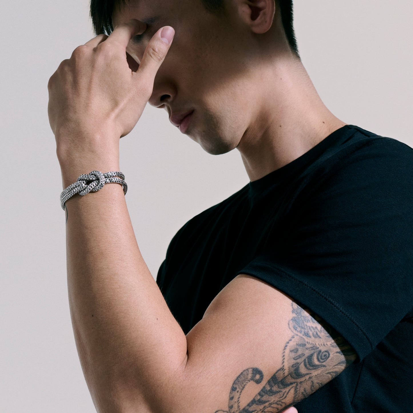 The soft woven bracelet features John Hardy's signature Love Knot—a symbol of commitment, resilience and love. Artisan handcrafted in 100% reclaimed gold and sterling silver.