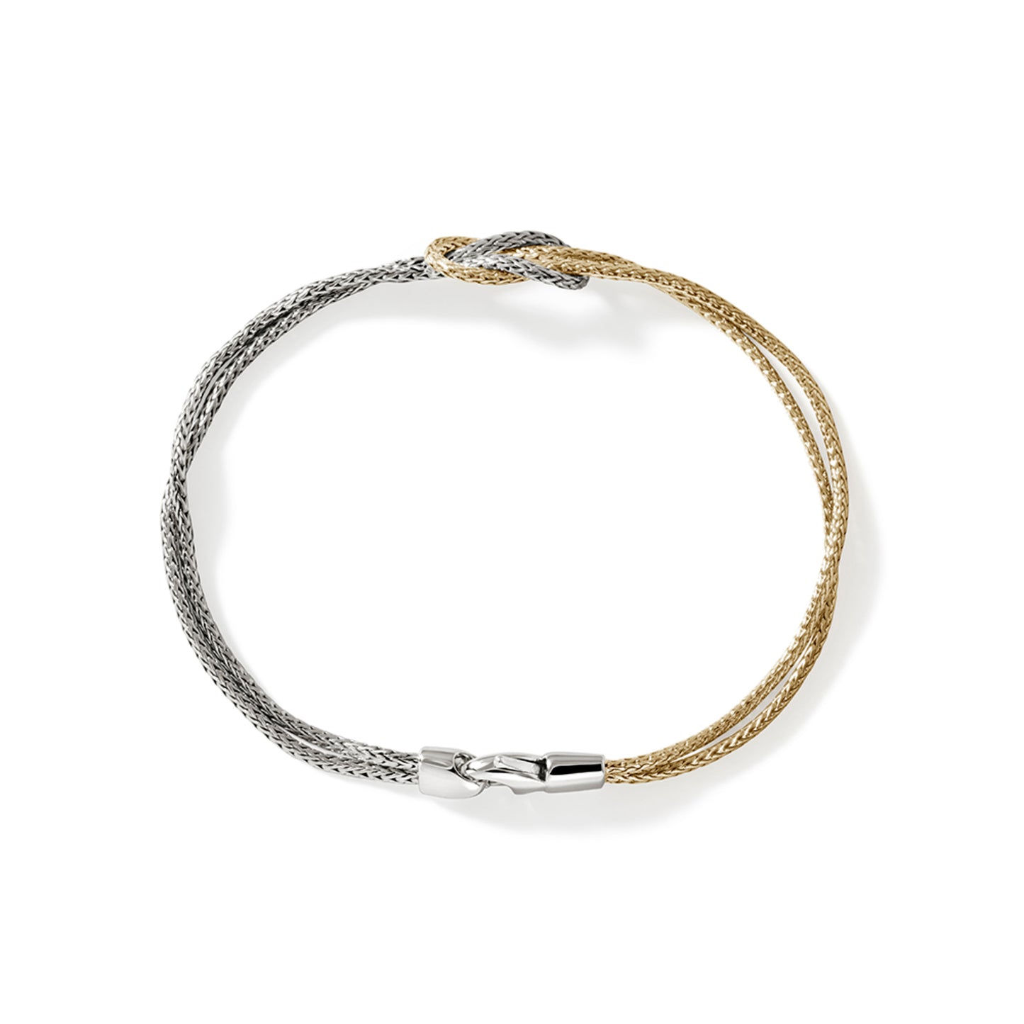 The soft woven bracelet features John Hardy's signature Love Knot—a symbol of commitment, resilience and love. Artisan handcrafted in 100% reclaimed gold and sterling silver.